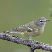 Formerly known as the Solitary Vireo, the Cassin's Vireo is now one of three separate species. Cassin's Vireos are olive above and whitish below, with a yellowish wash on their sides and flanks, white throats, and gray heads. They have two white wing-bars and distinctive white eye-rings that extend to the brow, making the birds look as if they are wearing spectacles.