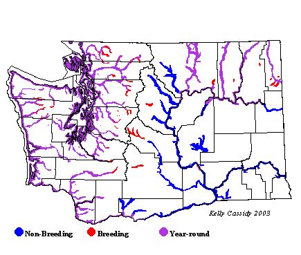 Western Washington has one of largest concentrations of Bald Eagles in the contiguous United States. They are common breeders along salt and fresh water at lower elevations throughout western Washington, especially in the San Juans and other northern Puget Trough islands and along both the north and west coasts of the Olympic Peninsula. They are uncommon breeders along major rivers and lakes in eastern Washington. They will nest fairly close to people; in fact several pair nest within the Seattle city limits. In winter, they are common in many areas with open water, including estuaries, major lakes, and rivers, especially those with salmon runs. Bald Eagles are well known for their abundance during the winter months on the Skagit River (Skagit County).