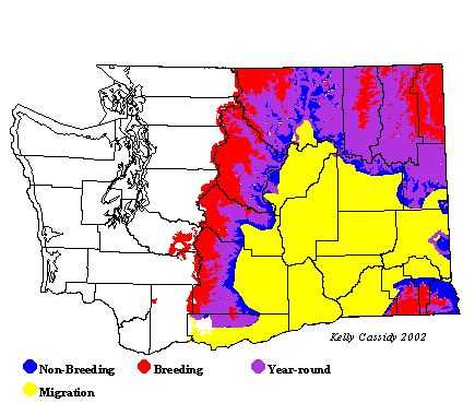 Cassin's Finches can be found in eastern Washington from May to October. Small numbers remain in eastern Washington in winter. A few are reported on the west side, but identification difficulties make these reports uncertain. Cassin's Finches tend to be found at higher elevations than Purple Finches, but all three (Cassin's, Purple, and House Finch) can be seen in eastern Washington where agriculture, pine forests, and rivers all come together. Although Cassin's Finches are generally widespread in eastern Washington, their occurrence in any given location is highly variable from year to year.