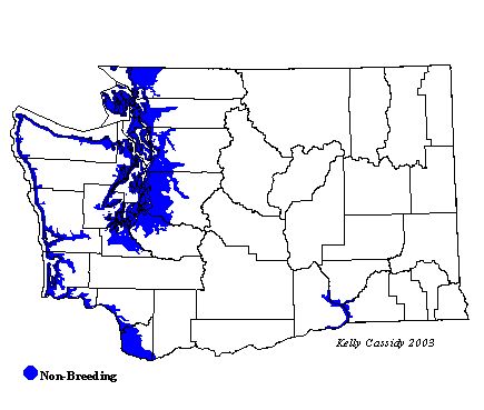 Mew Gulls are not known to breed in Washington, but breeding records exist from southern British Columbia, so breeding in Washington is a possibility. They are common all along the Pacific Coast from August to early May, and a rare visitor to eastern Washington from mid-September to mid-November. Groups of Mew Gulls can be found in agricultural fields along the lower Columbia River, and at the mouth of the River during the spring smelt runs in March.