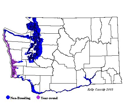 Western Gulls are common in all seasons along the Washington coast. The northern edge of the breeding range of pure Western Gulls is at Tatoosh Island in Washington, and south of Grays Harbor, most of the gulls are pure Western Gulls. Many of the birds breeding in Grays Harbor are hybrids. The hybrid zone extends farther to the north, but not into British Columbia. Large colonies of Western Gulls can be found at Grays Harbor, Willapa Bay, and the mouth of the Columbia River. Western Gulls have been recorded east of the Cascades, but are predominantly seen on the coast.