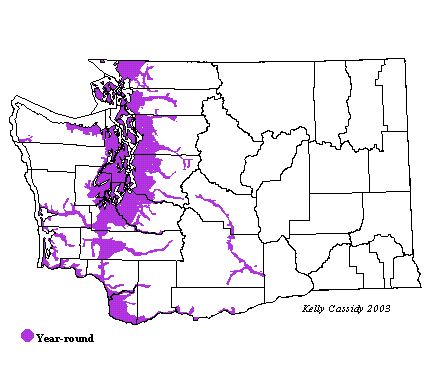Bushtits are common in appropriate habitat, especially suburban areas, throughout the Puget Trough, west to Ocean Shores and south to Vancouver, Washington. East of the Cascades, there are isolated populations of Bushtits along the Columbia River in Klickitat County, near Toppenish in Yakima County, and near Cle Elum in Kittitas County.