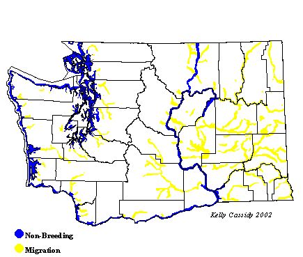 North-central Washington is the extreme southwestern limit of the summer range of this species, which is typically considered a more northern, boreal breeder. Breeding records in Washington are few and infrequent, but there have been records of breeding birds in northeastern Washington. During winter Horned Grebes are a very common visitor on the coast, in Puget Sound, and in other inland marine waters. They are uncommon in winter in the interior valleys west of the Cascades but have been found occasionally in the slackwater sections of the Columbia River in summer.