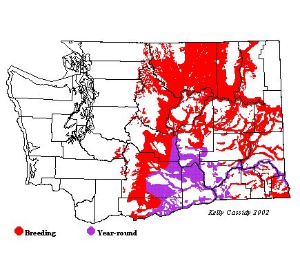 During summer, Rock Wrens are common in the steppe regions of eastern Washington. They also breed above the tree line in the rocky habitats and clear-cuts along the Cascade Crest and in the Blue Mountains of southeastern Washington. Vagrants can show up in western Washington during migration, and some breeding records exist in the San Juan Islands. They have also colonized the ash- and pumice-covered slopes of Mt. St. Helens, following the 1980 eruption. They may also be breeding above the tree line in the northeastern Olympic Mountains, but the majority of the breeding population is in the Columbia Basin. During migration, they are commonly found at high elevations. In mild winters, some Rock Wrens remain in small numbers at low elevations in southeastern and central Washington.