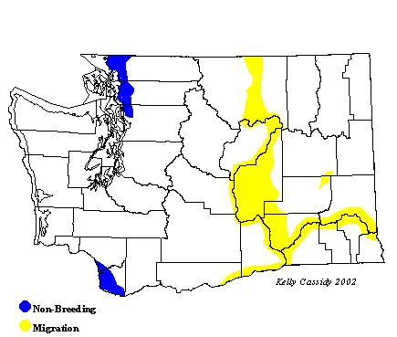 Snow Geese are typically seen in large flocks; up to 55,000 winter in western Washington. Most gather in the Skagit River Delta (Skagit County) from mid-October to early May. They can also be seen in eastern Washington during migration (mid-April to mid-May and mid-October to mid-November).